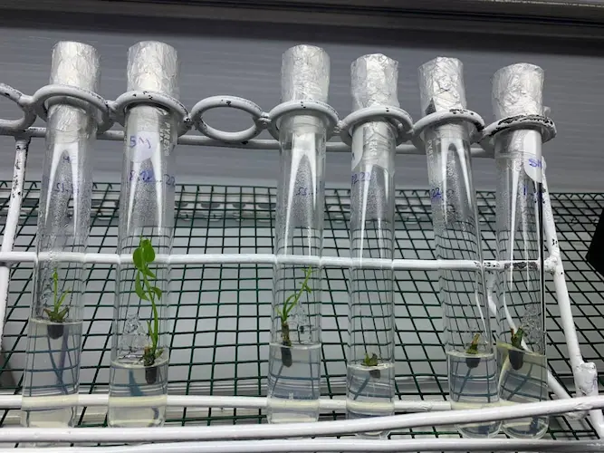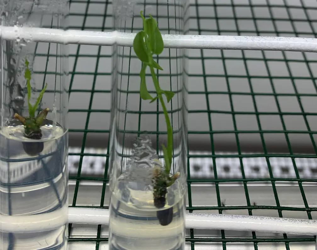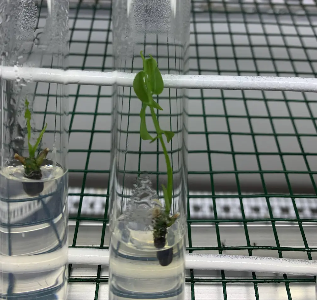 Sembradas en medio MS + complementos, presentan un tamaño máximo de 6 cm, con 4-5 nudos, libres de virus y patógenos. Hojas y nudos completamente desarrollados y fisiologicamente sanos. Venta de frascos que contiene de 4-6 plantas.